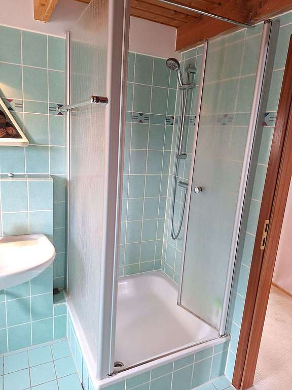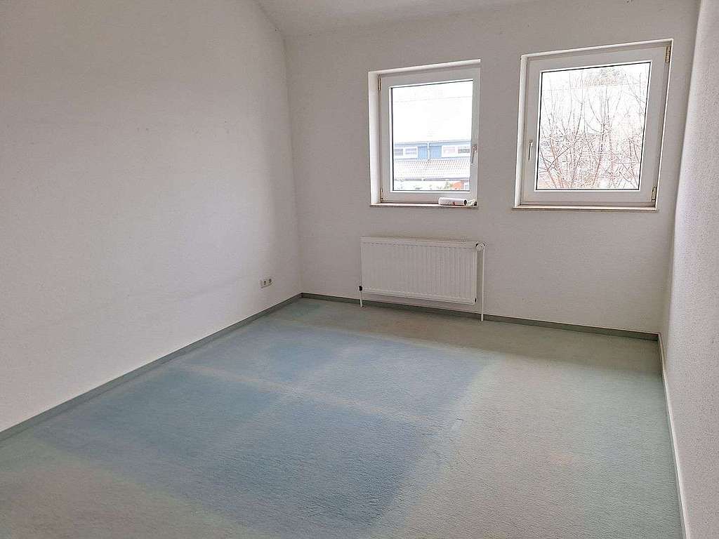 Das Obergeschoss umfasst drei Wohn-/ Schlafzimmer, ein Vollbad mit Fenster und einen Flur. Die Decken in den Schlafräumen verlaufen mit der ansteigenden Dachschräge - dadurch erreicht man teilweise Deckenhöhen von mehr als 3 m - in den Kinderzimmern könnte man durchaus mit Hochbetten arbeiten um zusätzlich Fläche zu gewinnen. Vom Flur aus gelangt man über eine Einschubtreppe in den Spitzboden, welcher gedämmt und mit Stehhöhe als Standort der Heizung und zum Abstellen dient.