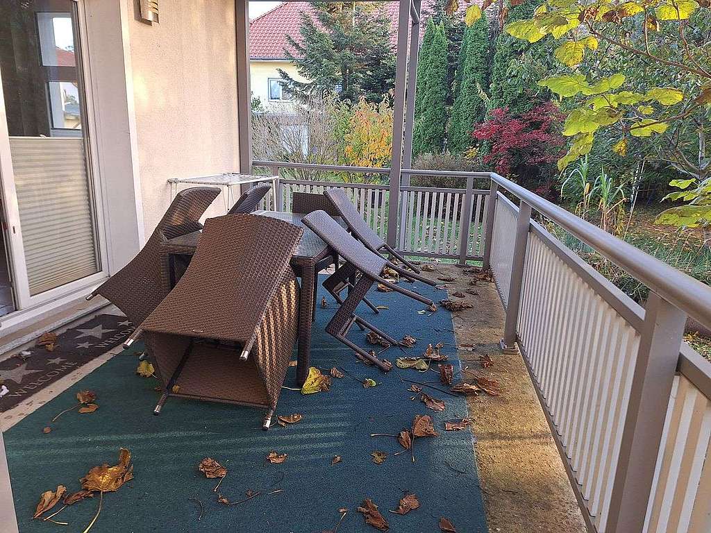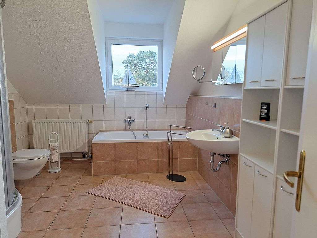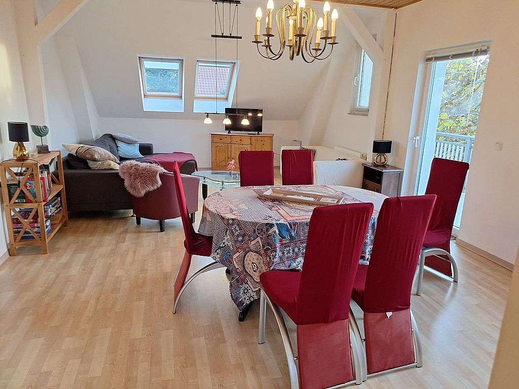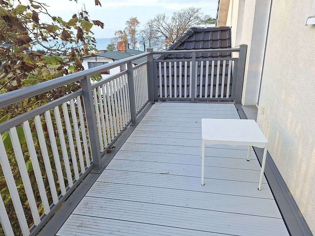 Von den nördlich ausgerichteten Zimmern der Wohnung im Dachgeschoss sowie dessen Balkon hat man einen weitläufigen Blick auf den Greifswalder Bodden, bei guter Sicht eventuell sogar bis zur Insel Rügen.