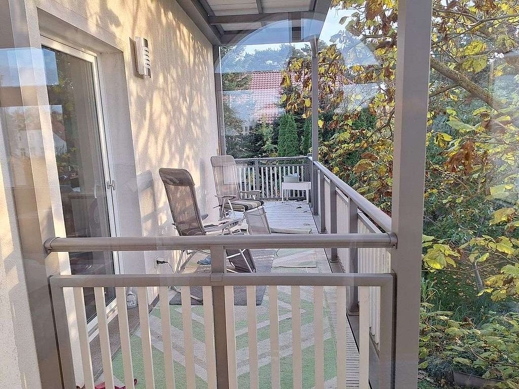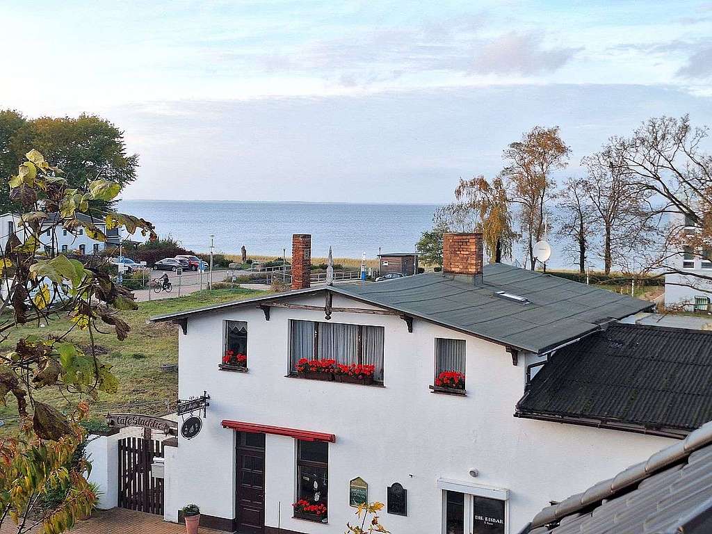 Von den nördlich ausgerichteten Zimmern der Wohnung im Dachgeschoss sowie dessen Balkon hat man einen weitläufigen Blick auf den Greifswalder Bodden, bei guter Sicht eventuell sogar bis zur Insel Rügen.