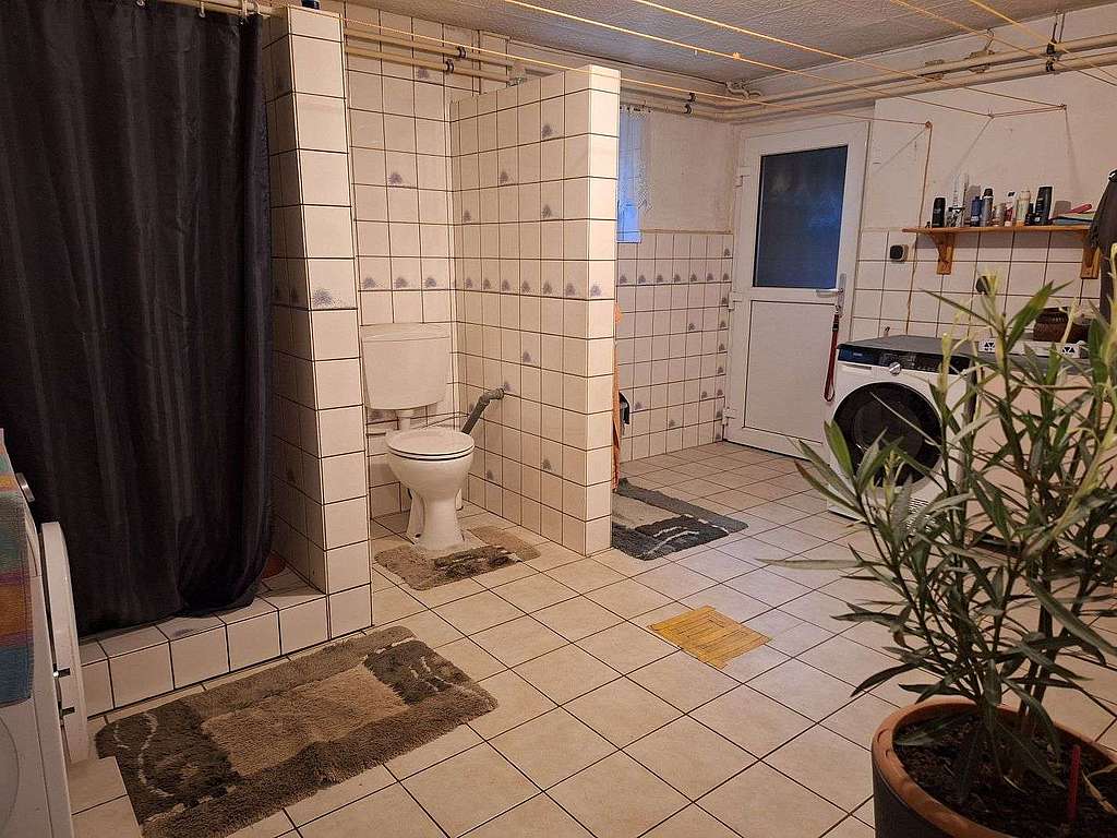 Im Kellergeschoss sind zwei weitere Wohn-/ Schlafzimmer, eine Waschküche mit WC und Dusche, ein Heiz- / Abstellraum, ein Flur sowie eine geräumige Garage mit elektrischem Tor angeordnet.