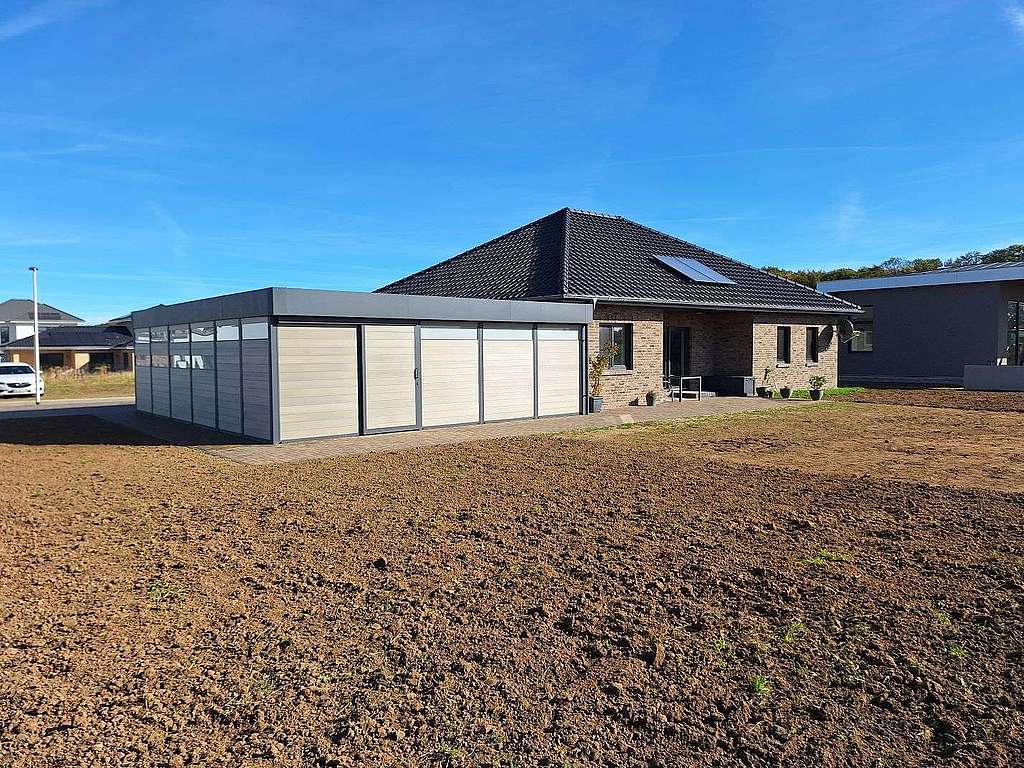 Das offen gehaltene Grundstück ist nach Süden ausgerichtet und bietet ausreichenden Platz für vielfältige Freizeitaktivitäten. Zudem kann man nach Süden einen äußerst weitläufigen Blick über ein Feld schweifen lassen. Auf dem Grundstück ist eine hochwertige Carport-Anlage (Stahl beschichtet) mit einer Grundfläche von 10 x 8 m errichtet worden. Hier finden 2 PKW´s eine großzügige Parkfläche; weitere überdachte und abgeschlossene Flächen für Fahrräder und zum Abstellen sind vorhanden.