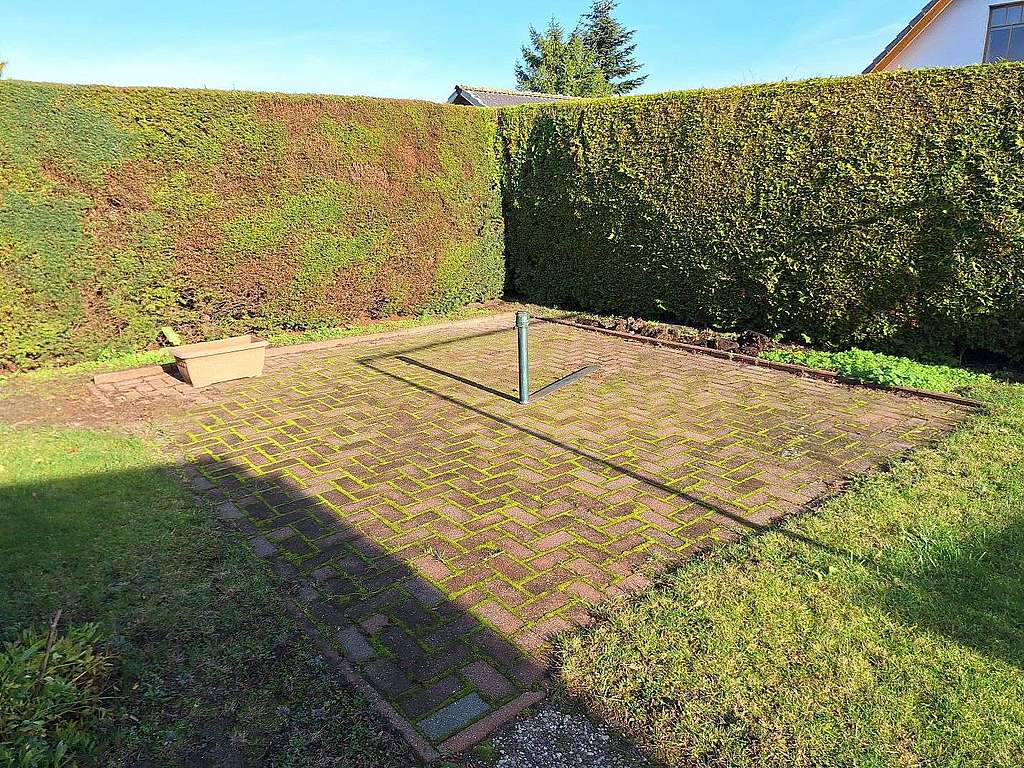 Das pflegeleichte Grundstück umfasst eine zweite Terrasse, eine massive Garage, weitere Außenstellplätze sowie einen Schuppen.