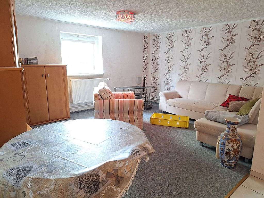 Vom Flur im Erdgeschoss gelangt man ebenso in das Kellergeschoss. Hier sind ein großes Wohnzimmer mit integrierter Küchenzeile, ein weiteres Wohn-/ Schlafzimmer, ein Duschbad mit Fenster, ein Hauswirtschaftsraum und ein Flur angeordnet.