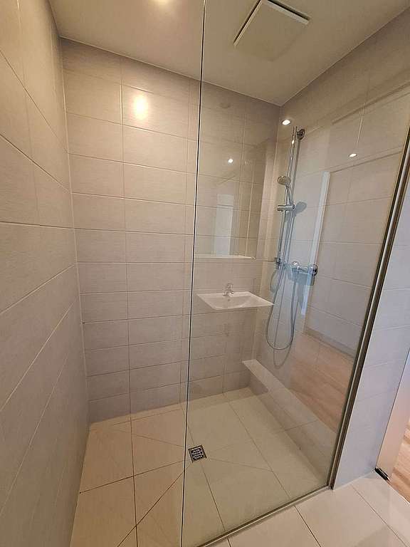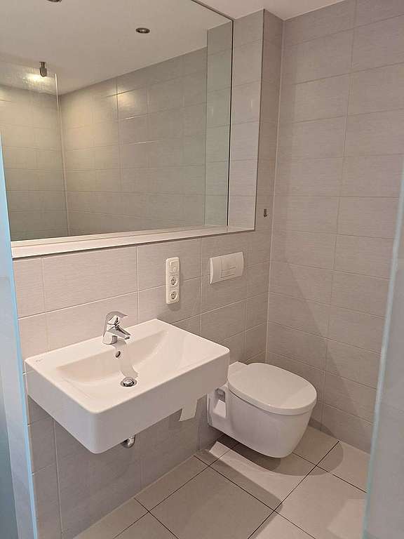 Das Zimmer und der Flur sind mit einem Vinylboden ausgestattet; das Bad ist gefliest.